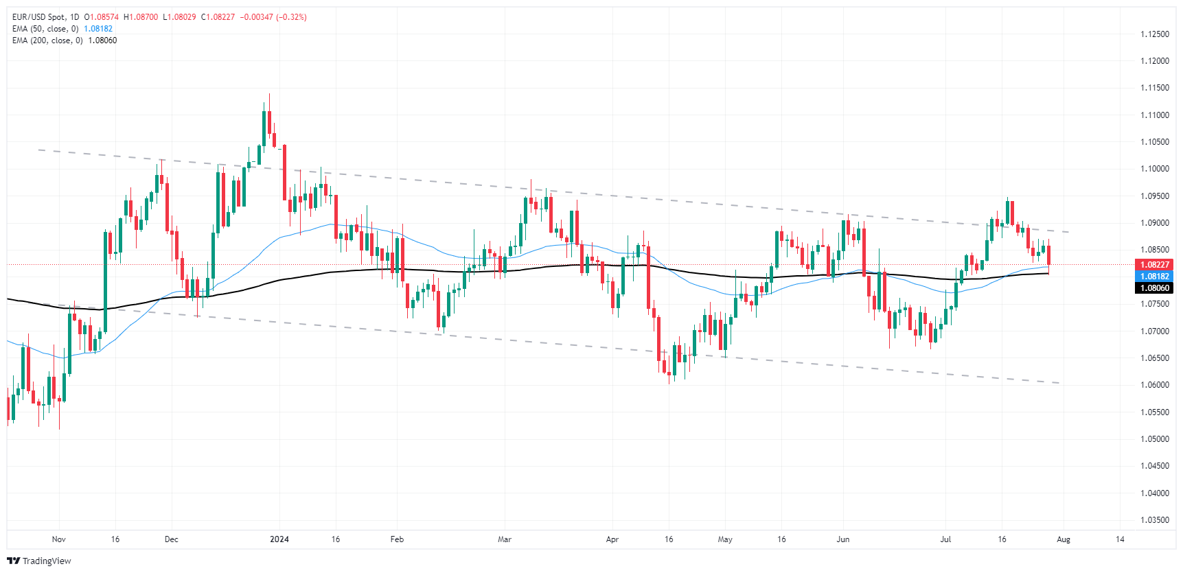 市场对欧元兑美元自数月高点的近期跌势押注加大,欧元兑美元下行逼近 1.0800 区域,回到了 200 日指数移动均缐(EMA)1.0795 的范围内。