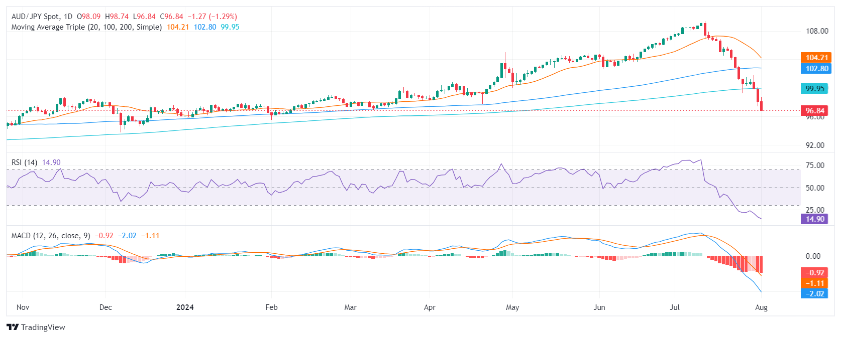 侭管澳元/日圆周一出现了小幅反弹的迹象,但看跌趋势仍在延续,本周跌幅巨大,交易量减少强化了这种下跌情绪。继跌破关键的 100.30 支撑位后,澳元/日圆目前位于 97 点附近。