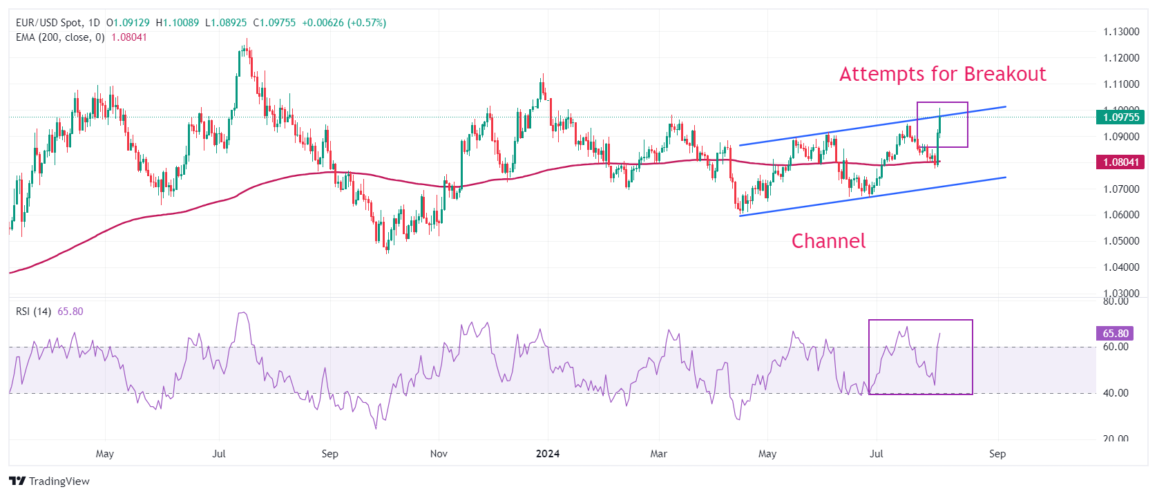 - 由于担心美国经济放缓,美元暴跌,欧元兑美元跳升至 1.1000 附近。
