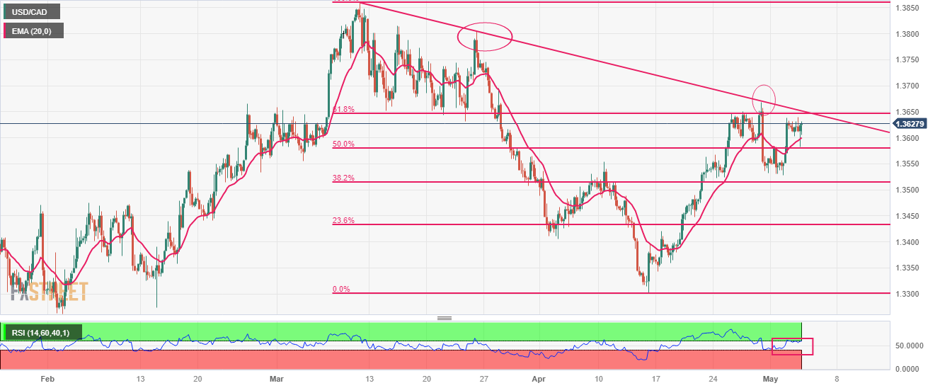如果美元/加元延续上涨突破61.8%斐波位1.3650上方,将触发反转,并将提振美元/加元上涨接近整数关水平阻力位1.3700。若美元/加元突破该阻力位将测试3月22日的高点1.3745。