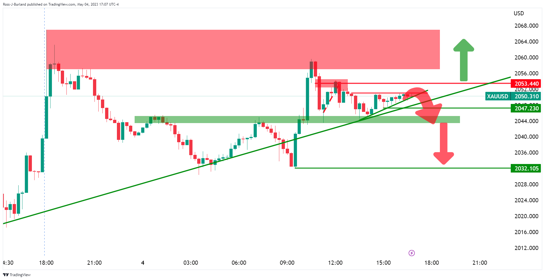 价格被卡在2050美元附近的阻力区域,并受到小型趋势缐2040.00美元支撑。若金价跌破2047.00美元,则有可能测试2,032.10美元支撑水平。上行方面,金价空前高位将是2,075美元附近。