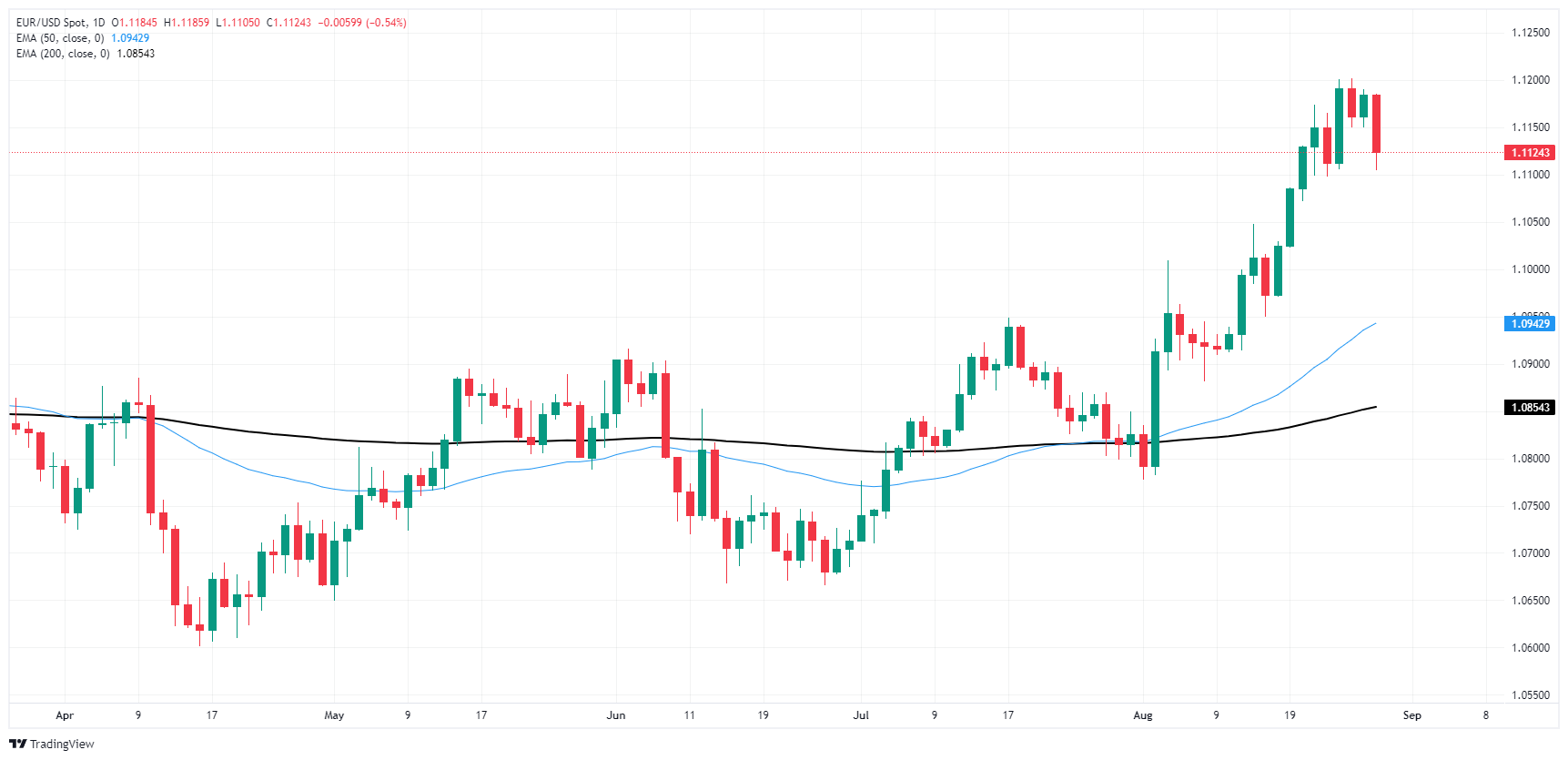 欧元兑美元周三回落至1.1150关口下方,侭管多头试图推动上涨。欧元/美元仍在测试 200 日指数移动均缐 (EMA) 1.0850 上方,但如果持续下滑,很快就会跌回 50 日指数移动均缐 1.0940 附近。