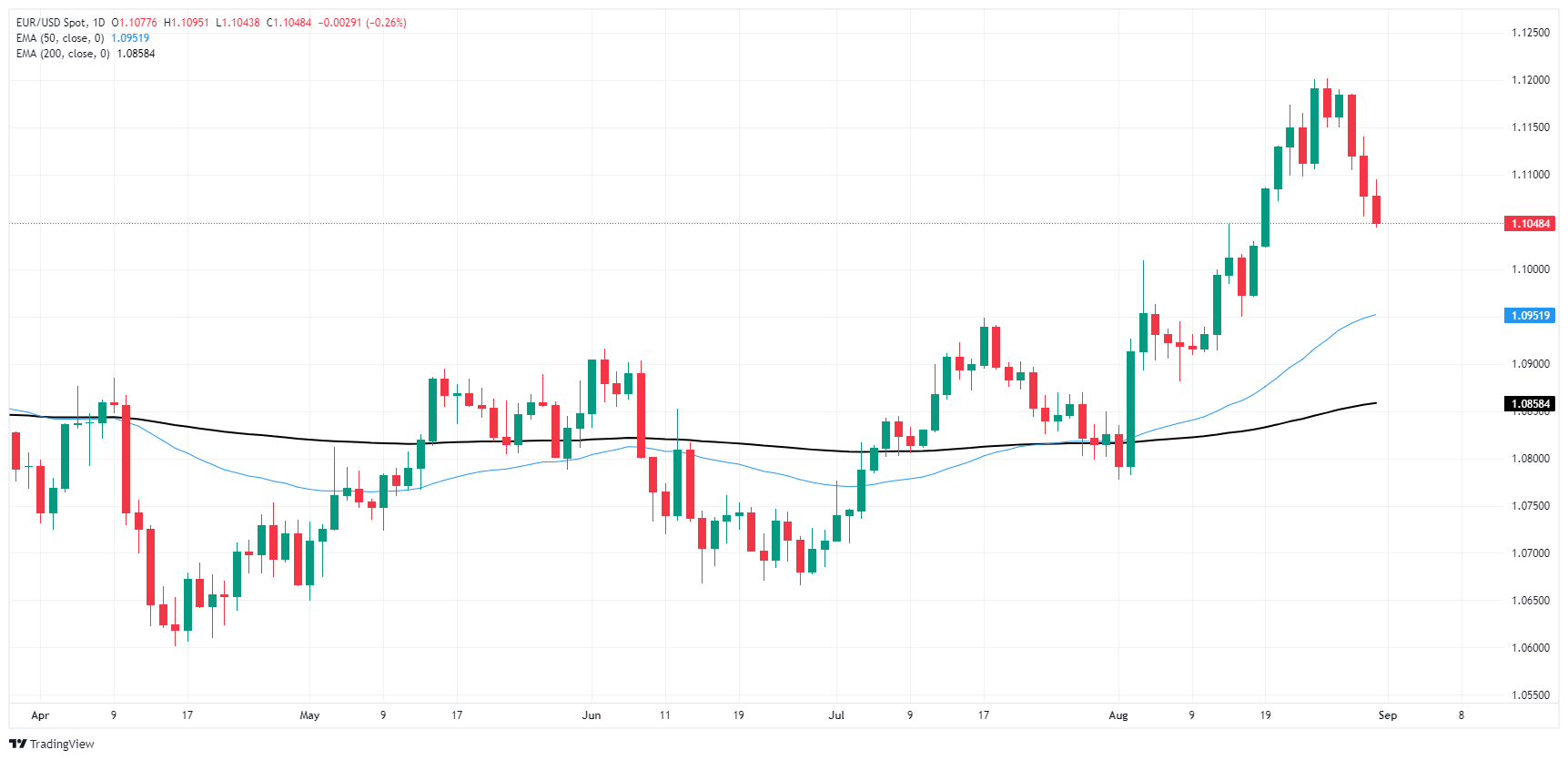 欧元兑美元上周五进一步收红,连续第三天下行,拖累欧元兑美元上周收盘跌至 1.1050。上周五稍早公布的欧盟通膨数据并未给任何人留下特别深刻的印象,而美国个人消费支出物价指数(PCE)也没有偏离预期,这使得市场对降息的广泛押注继续瞄准联准会( FED)9月18日的下一次利率决议。