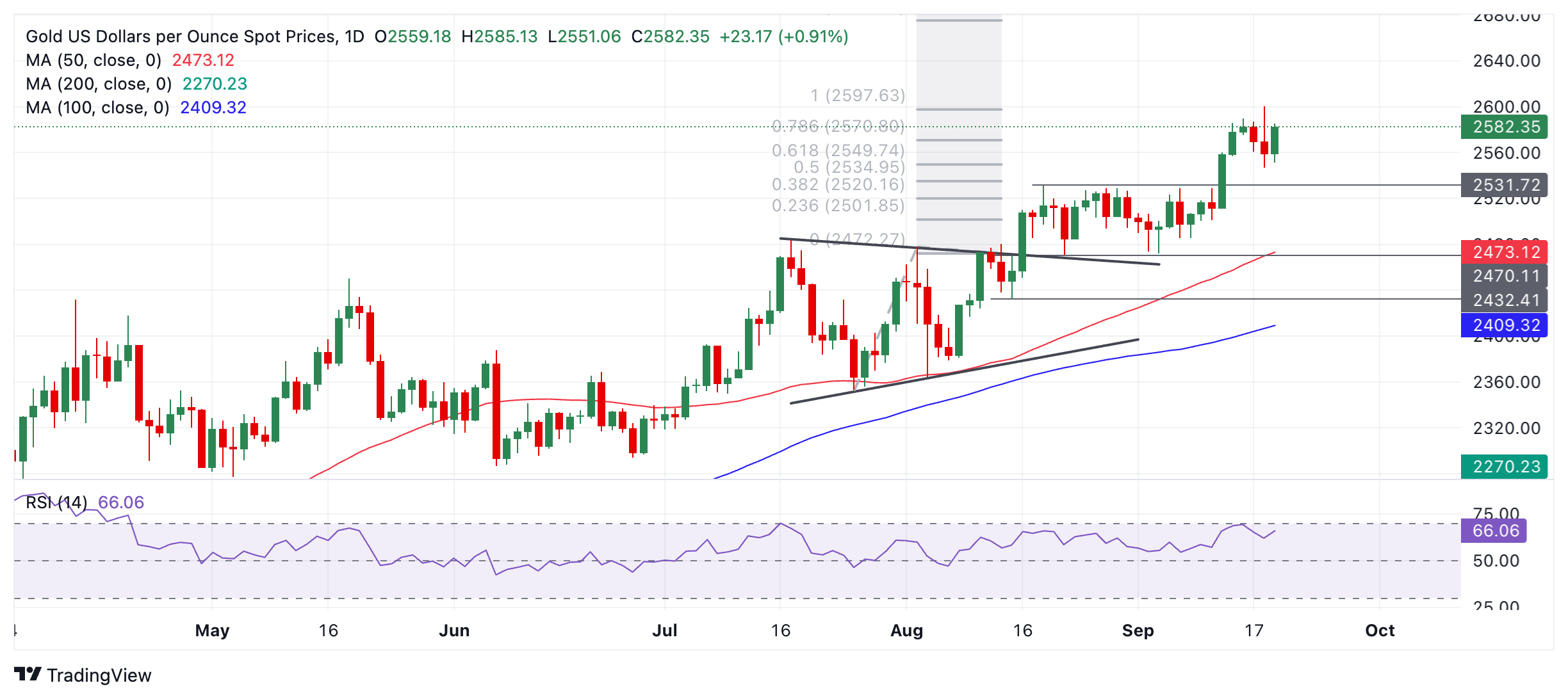 黄金(XAU/USD)走高,在前一天美国联邦储备委员会(美联储)做出利率决定后跌至2540美元,周四重返2580美元。
