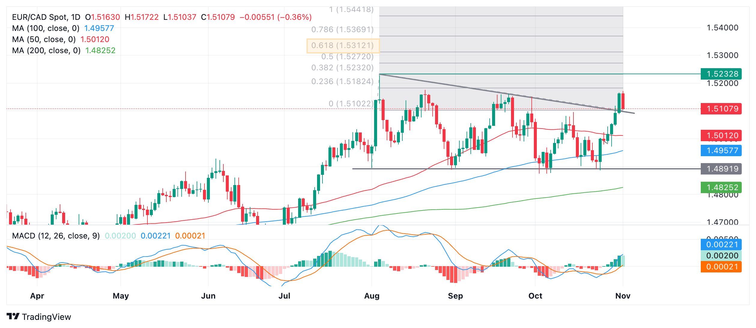 欧元/加币上涨,并果断刺穿了自 8 月初以来的价格形态的斜顶。这是一个看涨迹象,如果价格继续走高,则可能会大幅上扬。