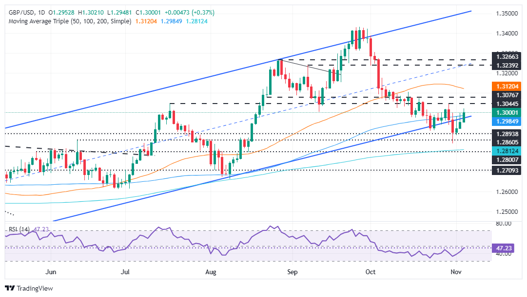 在周一短暂盘整后,英镑兑美元清除了 1.3000 这一关口,不过仍略微偏向下行。𧹒方需要重新夺回 10 月 30 日的波段高点 1.3047 才能控制局面,并将货币对推向 1.3100。一旦突破这些水平,下一个阻力将是位于 1.3118 的 50 日均缐。