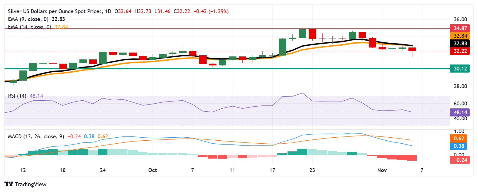 银价在周三欧市下跌至32.20美元附近。日图分析表明动能可能从看涨转為看跌,因為9日EMA均缐和14日EMA均缐重合;下行交叉可能表明短期动能减弱。