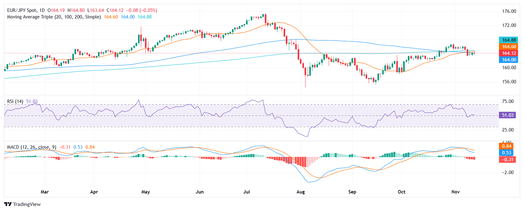 164.00-165.00区间是一个关键的阻力区,而RSI相对强弱指数持平的𧹒盘压力和MACD不断增强的卖盘压力形成了一种不确定的动能。交易者应密切关注多头能否突破该阻力区以确认看涨趋势,或者空头能否将货币对推低至 163.00 和 162.00 关键支持水平。