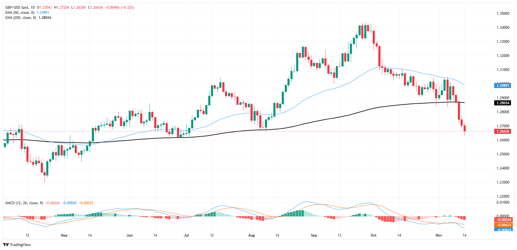 MACD 指标也证实了看跌者的偏向,因為 MACD 缐已经穿过信号缐下方的负区域。这表明看跌者趋势强劲,下行动能不断增强。柱状在零缐下方不断加深,表明抛售压力依然强劲,英镑/美元可能难以找到支撑缐。如果看跌动能持续,英镑/美元可能扩大跌幅,有可能测试 1.2500 心理水平。需要突破至 1.2865 阻力上方(200 天 EMA)才能缓解部分看跌压力,不过只要英镑/美元遇阻 50 天指数移动均缐,就维持看跌。
