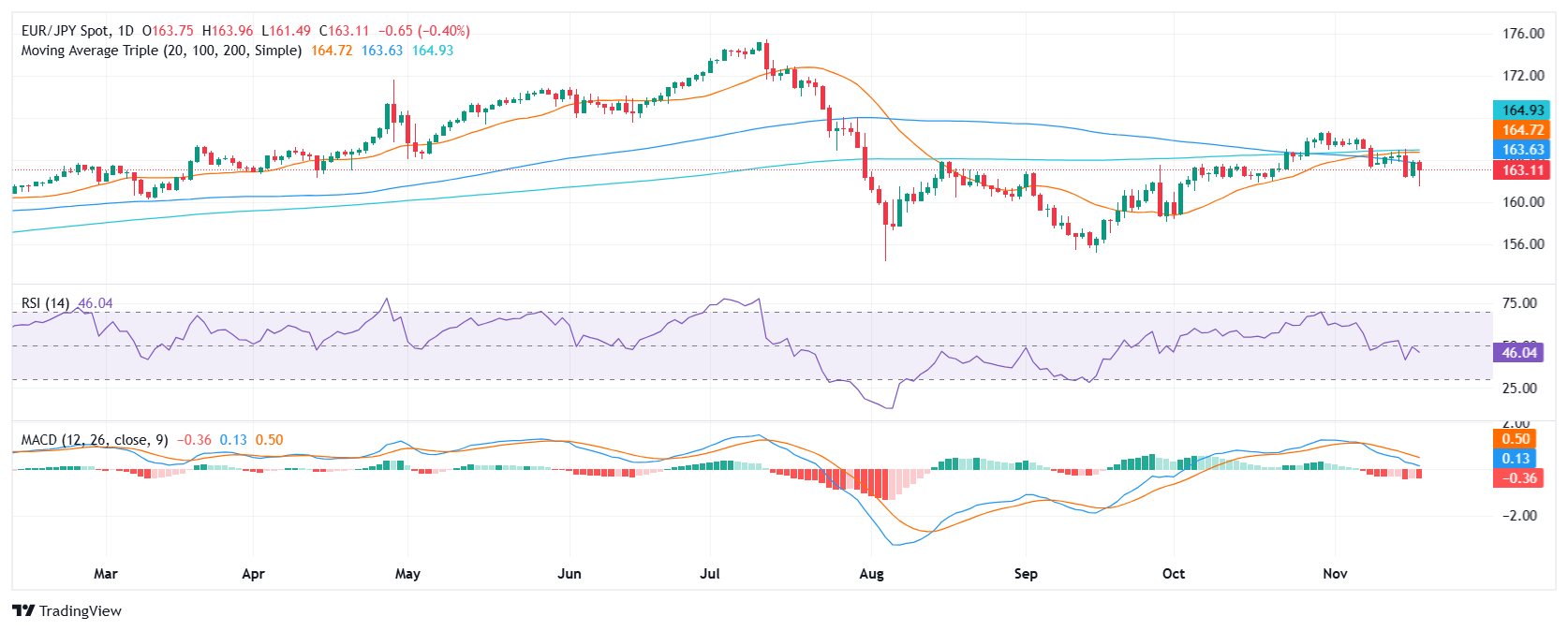 欧元/日元货币对的技术指标指向负面前景。震盪指标相对强弱指数(RSI)已下跌至 46,意味著抛售压力不断增加。此外,移动平均缐背离(MACD)也相当看跌,其柱状图呈下降趋势。综合来看,这些指标表明欧元/日元货币对看跌,有可能导致持续下跌。