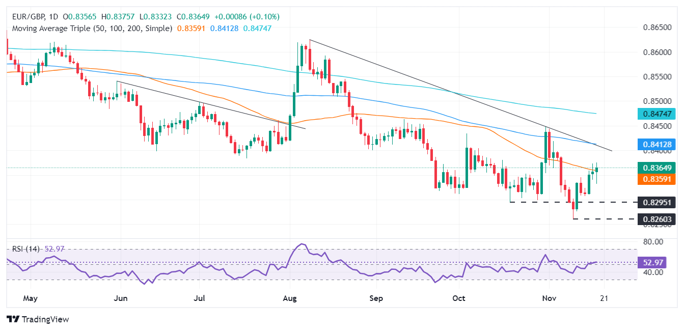 欧元/英镑连续第四日扩大涨幅,走高至50日均缐(SMA)上方,截至发稿时為0.8373。
