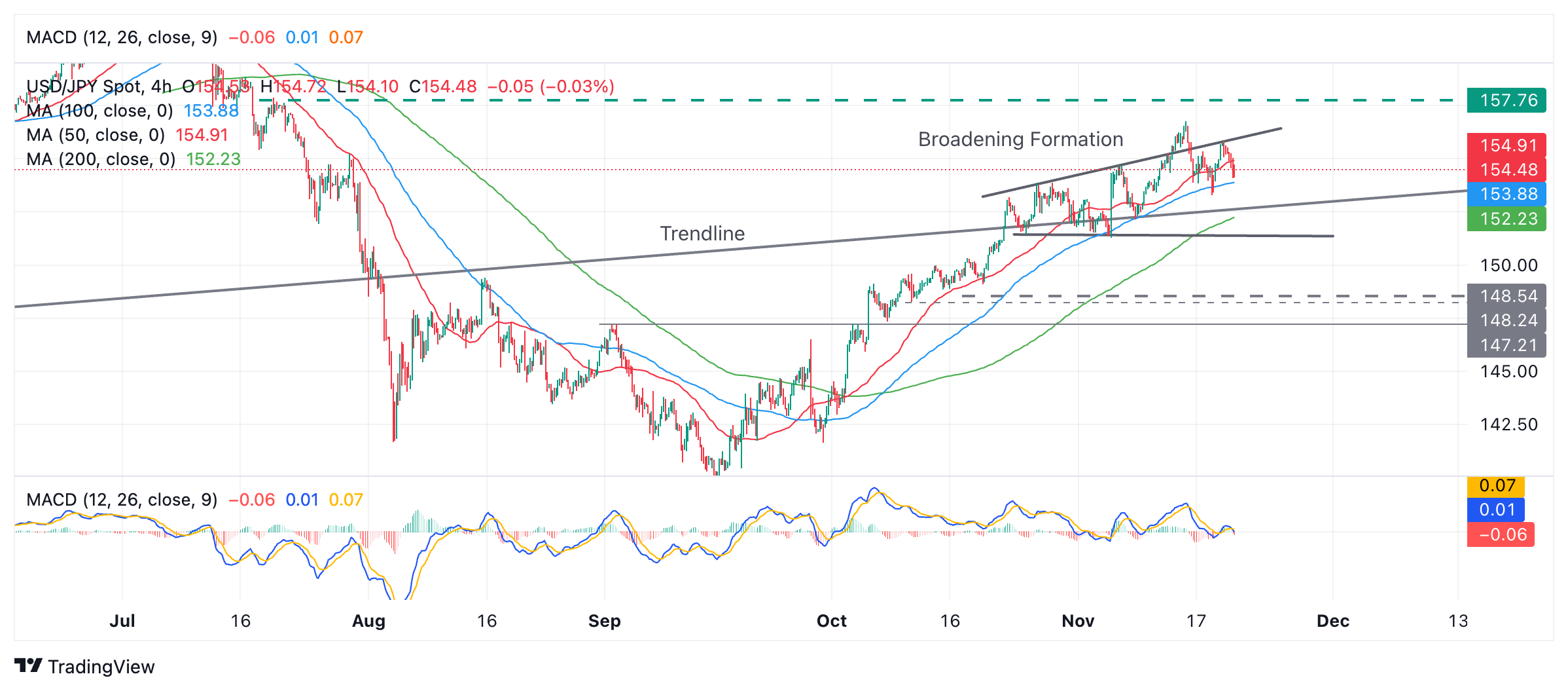 美元/日元可能仍在形成具有看跌潜力的 "扩张形态 "过程中。如果是这样,那麽最终可能会跌向该形态的下边界缐 151.50 附近。之后,它甚至可能跌破该边界缐,并跌至 "扩张形态"(Broadening Formation,BF)的预期目标 148.54 附近。