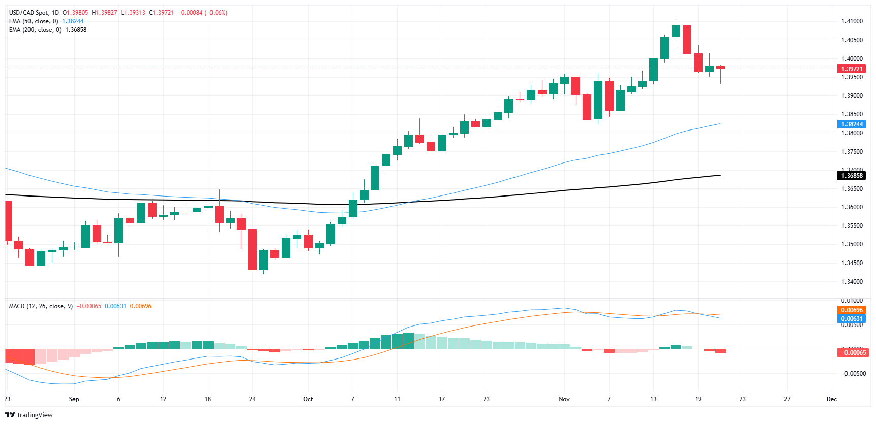 加元(CAD)周四测试了六天低点,但下跌至𫔭盘水平。美元/加元自11月13日以来首次回落至1.3950下方,但由于缺乏持续动能,美元/加元维持在1.4000下方。