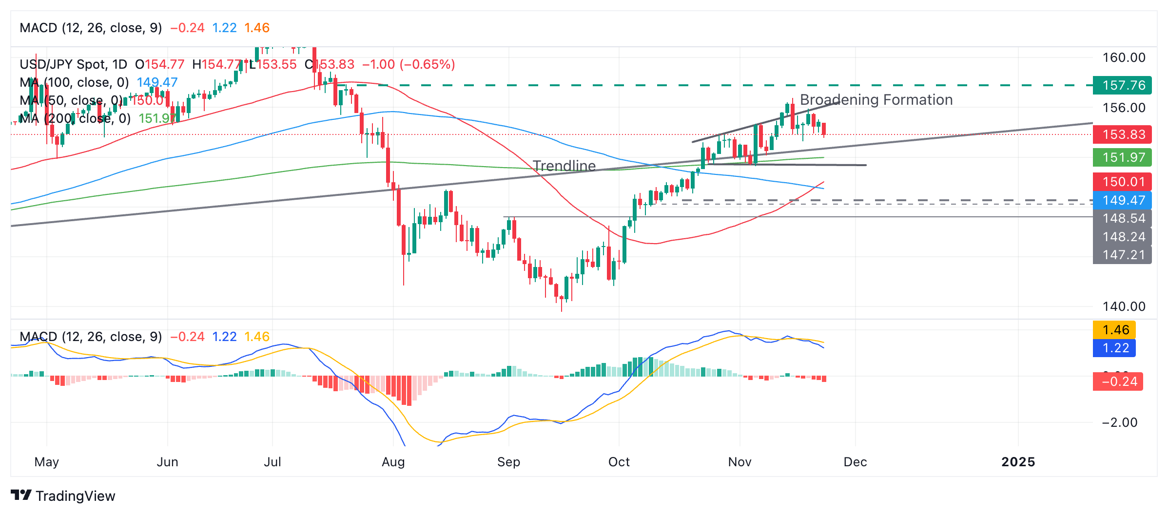 11 月 14 日,美元/日元超过了形态 的上边界缐,次日又迅速下跌至其内部。这可能是动能耗尽的迹象,预示著即将出现逆转。