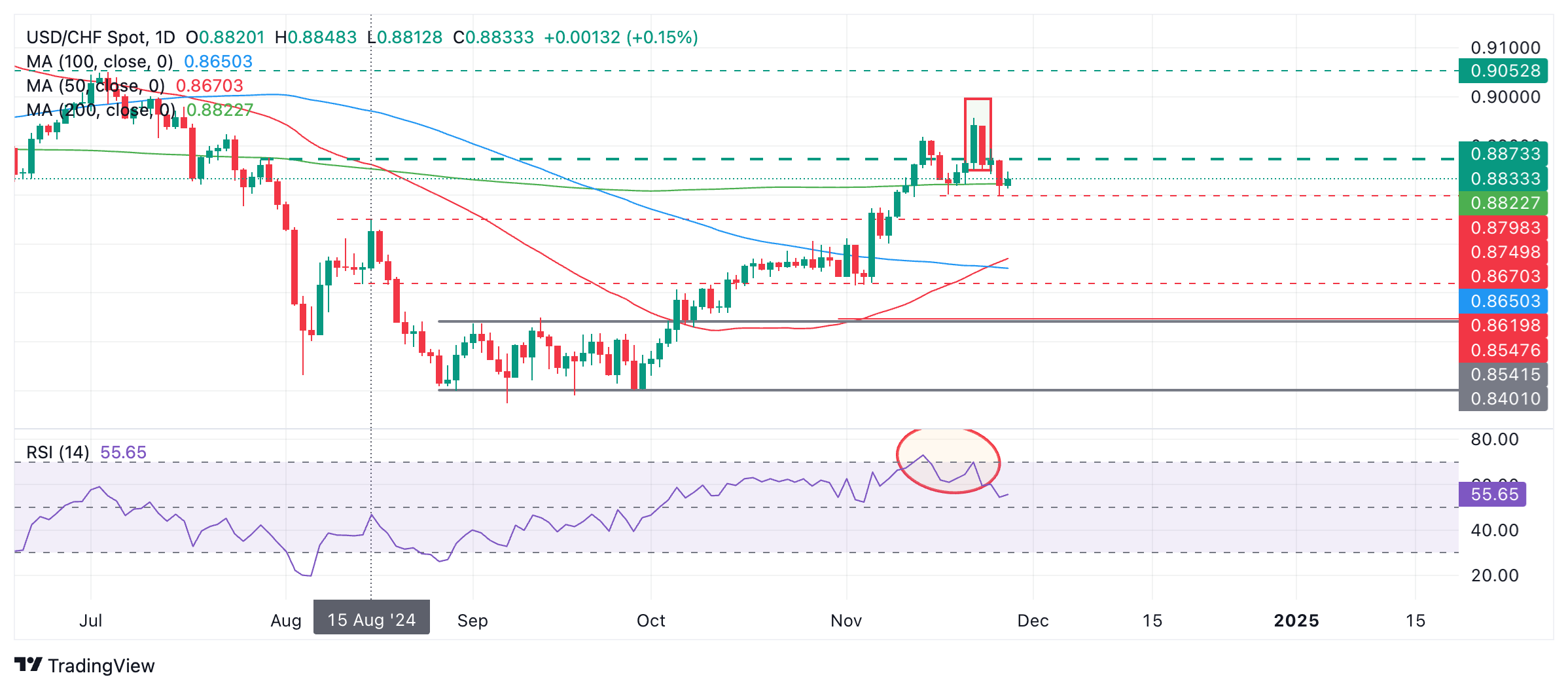 - 美元/瑞郎已跌破关键水平,使上升趋势受到质疑。