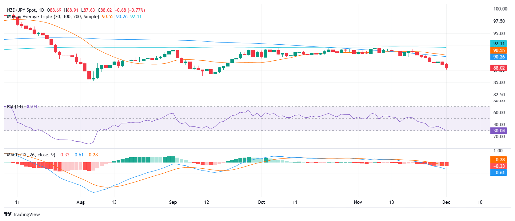 - 纽元/日元周一下跌 0.79%,交投于 88.05 附近。