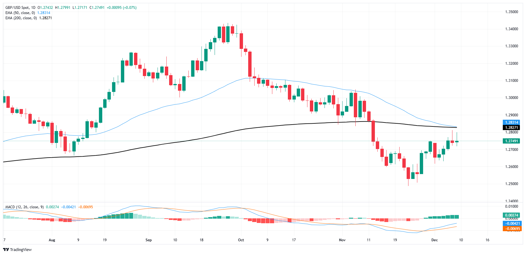 MACD 指标显示出看涨者背离的早期迹象,因為异同移动平均缐缐持续走高,接近信号缐。虽然这表明看跌者的动能正在减弱,但还不足以确认逆转,除非英镑/美元突破 50 天指数移动均缐附近的关键阻力。交易者应密切关注价格走势,如果英镑/美元从当前水平回撤可能会强化更广泛的下跌趋势,而突破 1.2830 上方,则将增强看涨前景。