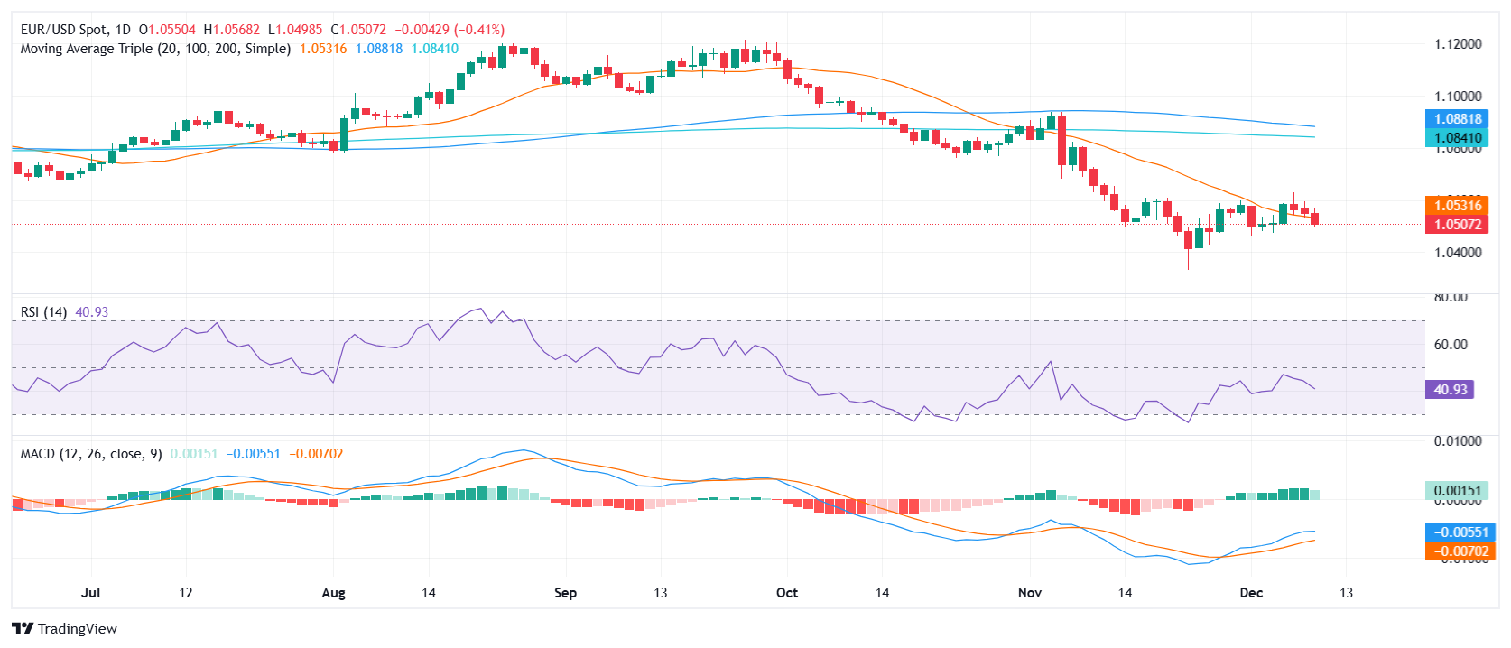 - 欧元/美元周二下跌 0.33%,跌破 20 SMA 后报收于 1.0525。