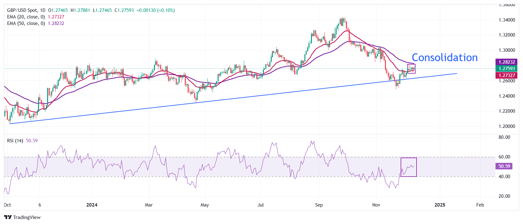 英镑/美元在 1.2750 附近窄幅盘整近一周,略高于 1.2720 附近的 20 天指数移动均缐 (EMA)。
