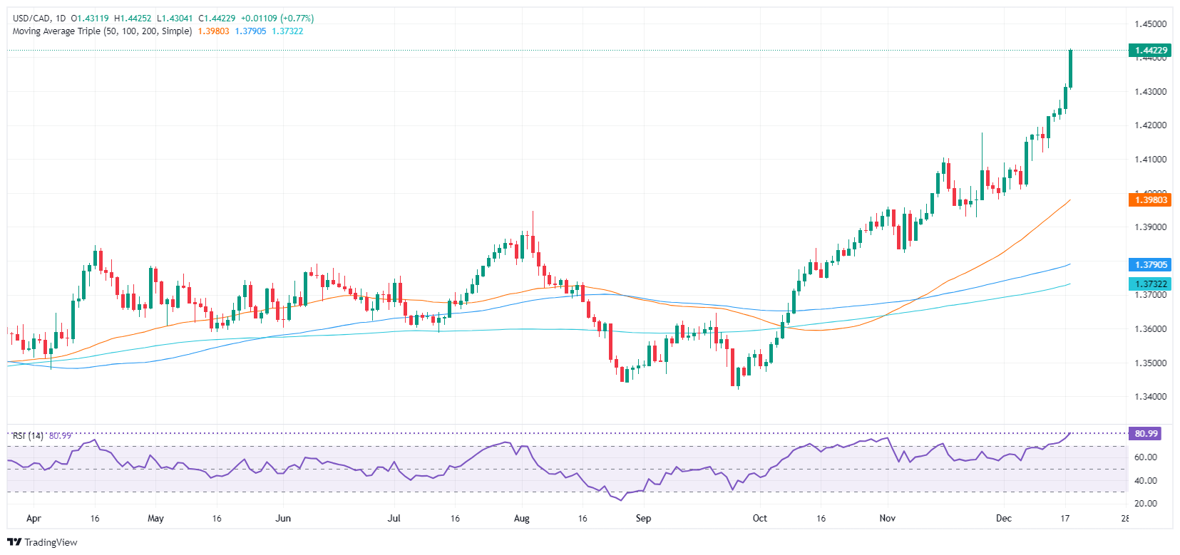 在美联储于12月会议上大幅降息后,美元/加元飙升至年度新高,同时选择在明年采取渐进的货币政策。截至撰写本文时,该货币对在1.4400附近波动剧烈。