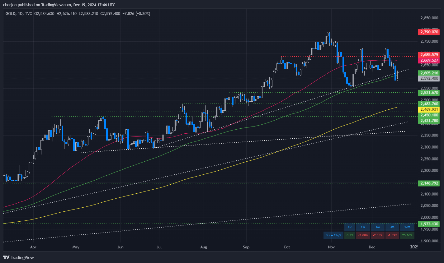 周四,黄金价格收复了周三的一些跌幅,微幅上涨0.20%。周四的小幅上涨是由于美联储(Fed)决定采取更渐进的立场,反对2025年三次降息。黄金/美元交易价格為2,588美元,日内高点為2,626美元。