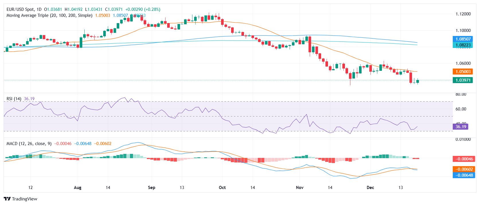 在周三遭受超过1%的大幅下跌后,欧元/美元在周末前小幅反弹,周五上涨0.28%,交易于1.0395附近。侭管有这一温和的改善,该货币对仍低于20日简单移动平均缐(SMA),这继续限制上行潜力并保持谨慎的前景。
