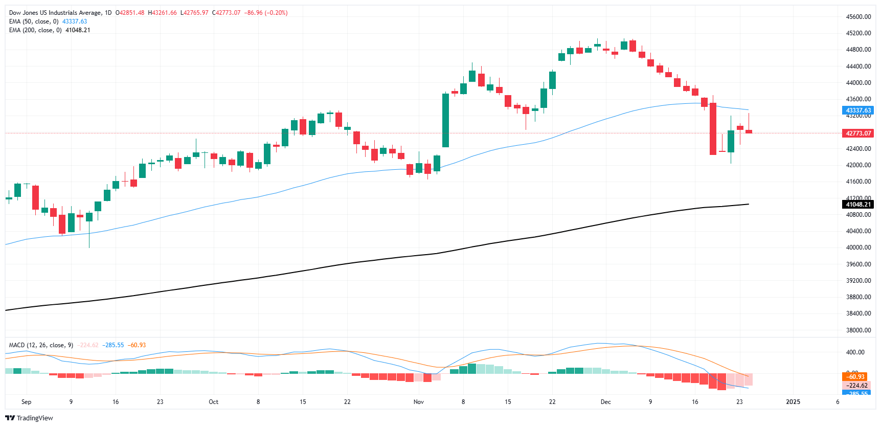 在连续三周下跌后,道琼斯股票 2024 年的辉煌走势似乎正在喘息。道琼斯工业平均指数从 45,000 点以上的历史高点下跌了近 5%,在 43,000 点关口以南试探性下跌。