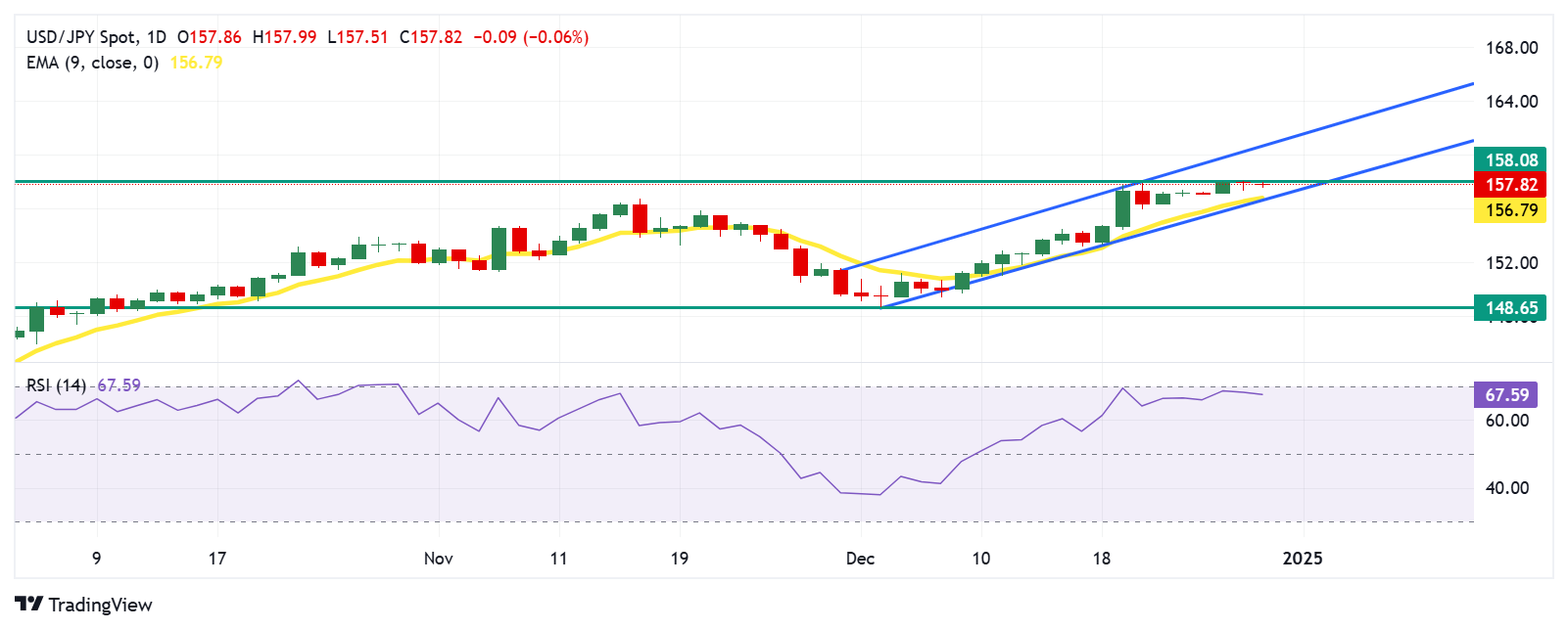 美元/日元周一在 157.80 附近交易,在日缐图上保持看涨势头。14 天相对强弱指数 (RSI) 徘徊在 70 水平以下,支撑看涨趋势。然而,如果 RSI 超过 70 大关,则可能表明超𧹒状况,可能引发下行修正。