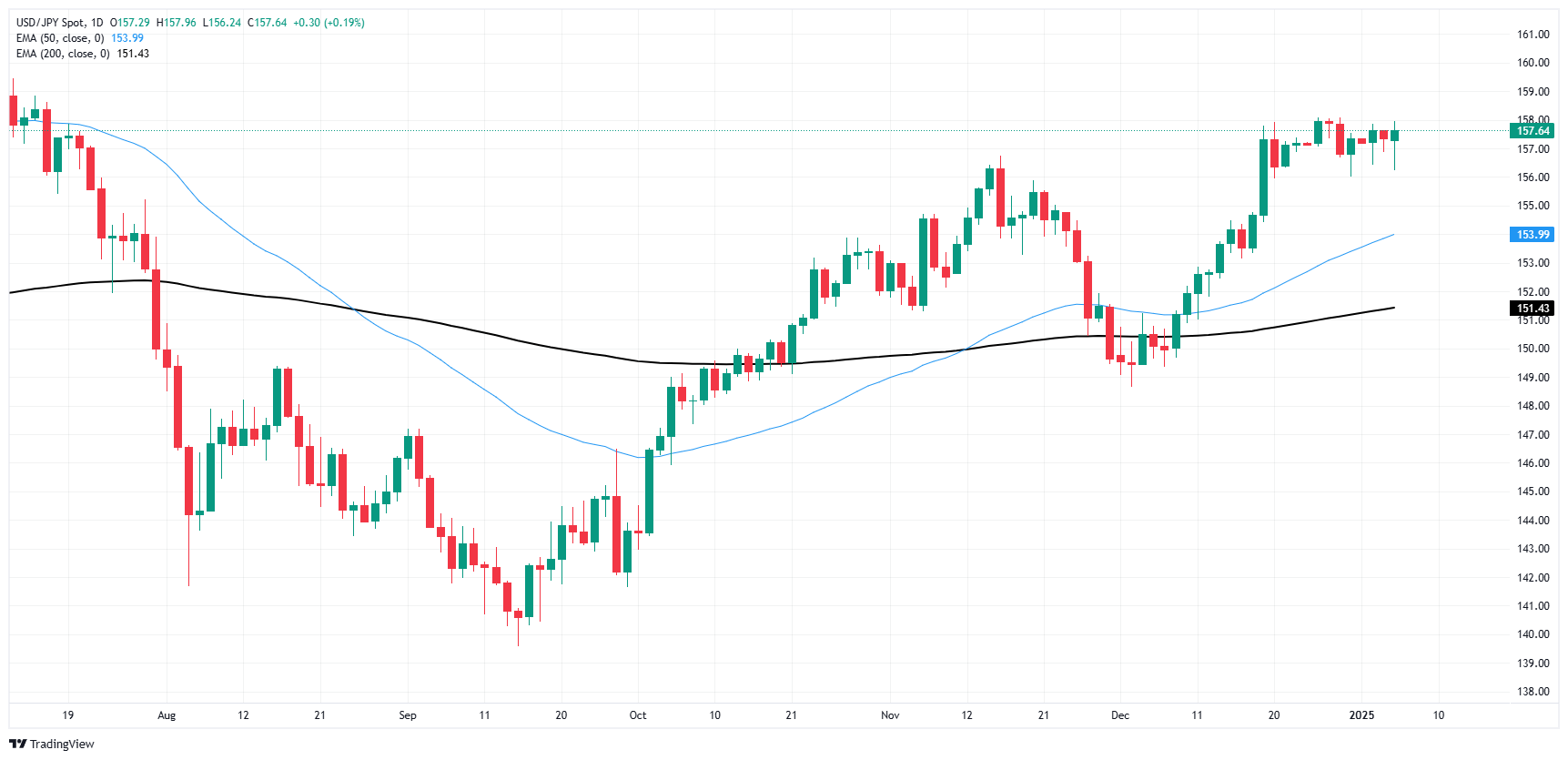 美元/日元周一在熟悉水平附近震盪,进入新交易周后基本持平。由于投资者在等待美联储(Fed)或日本央行(BoJ)的举措,该货币对在近期高点附近循环。预计这两家中央银行都将在2025年对利率采取更多举措,美联储的目标是下调利率,而日本央行预计将𫔭始加息。