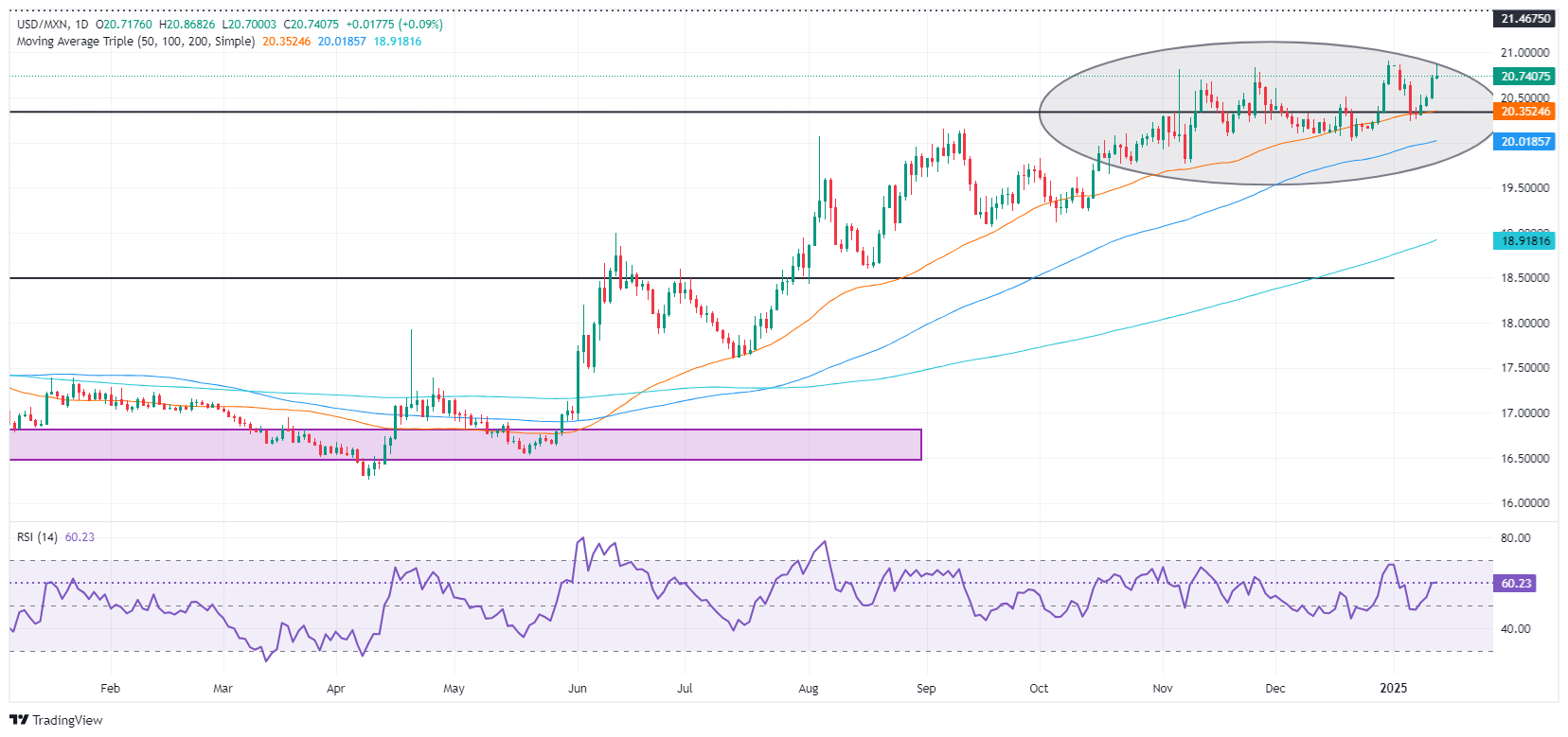 相反,如果美元/墨西哥比索跌破20.50,这将暴露50日简单移动平均缐(SMA)在20.30。一旦突破,下个目标是心理关口20.00,然后是100日SMA在19.96。
