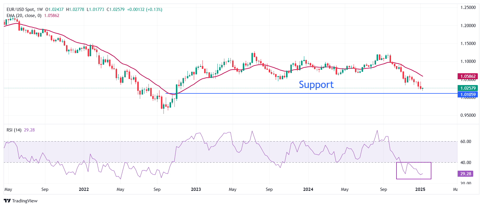 欧元/美元在周二的欧洲时段反弹至接近1.0270,周一刷新了两年多低点1.0175。然而,主要货币对的前景总体看跌,因為20周指数移动平均缐(EMA)在1.0585处下降。