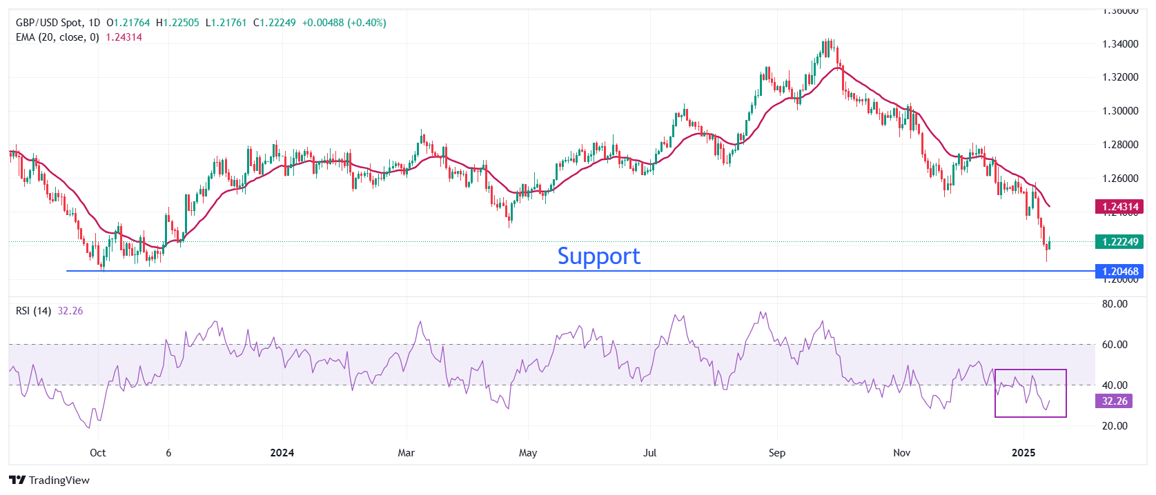 - 周二欧洲时段,英镑兑美元(USD)反弹至接近1.2250,周一曾从年度新低1.2100反弹。然而,由于市场普遍预期美联储(Fed)今年将减少降息次数,英镑/美元前景依然疲弱。追踪美元兑六种主要货币价值的美元指数(DXY)在撰写本文时小幅下跌至接近109.60。美元指数在周一创下超过两年新高110.00以上后略有回调。