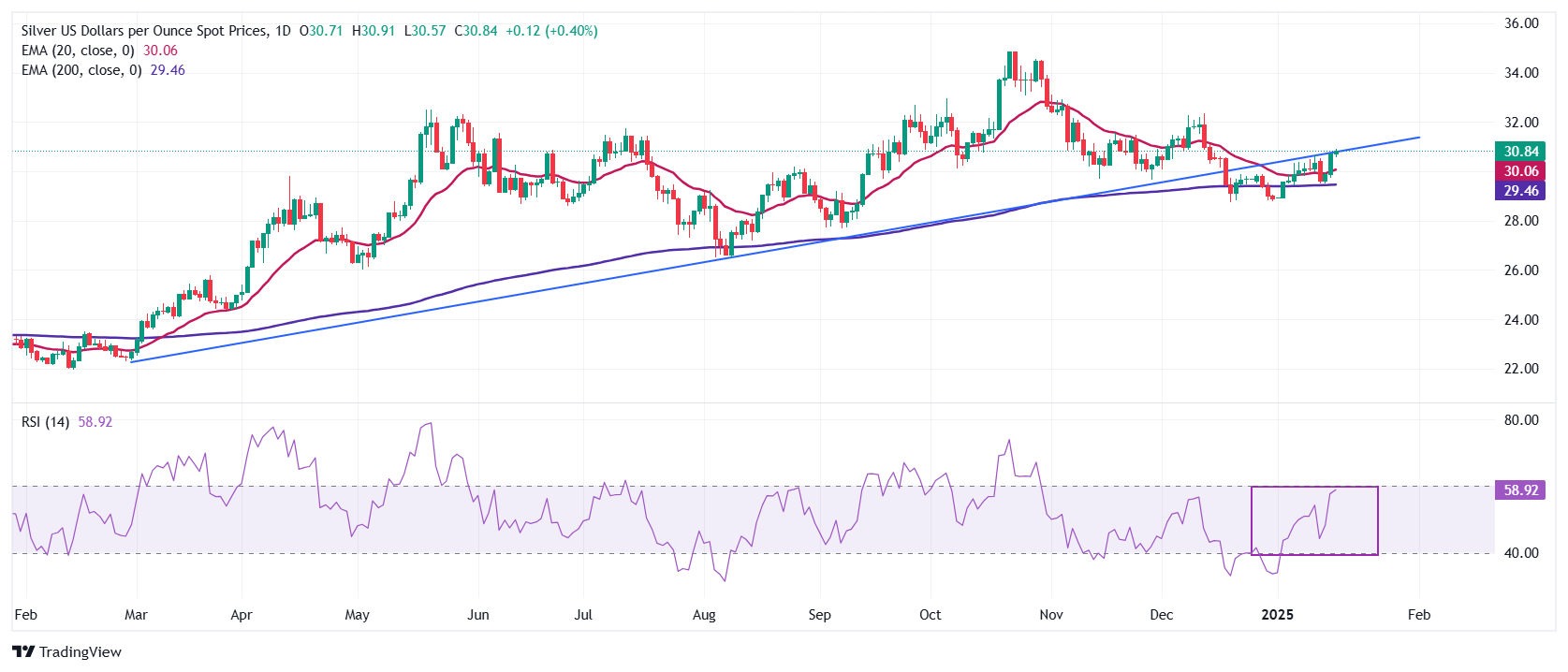白银价格聚集力量突破30.85美元附近的上升趋势缐,该趋势缐是从2024年2月29日的22.30美元低点在日缐图上绘製的。
