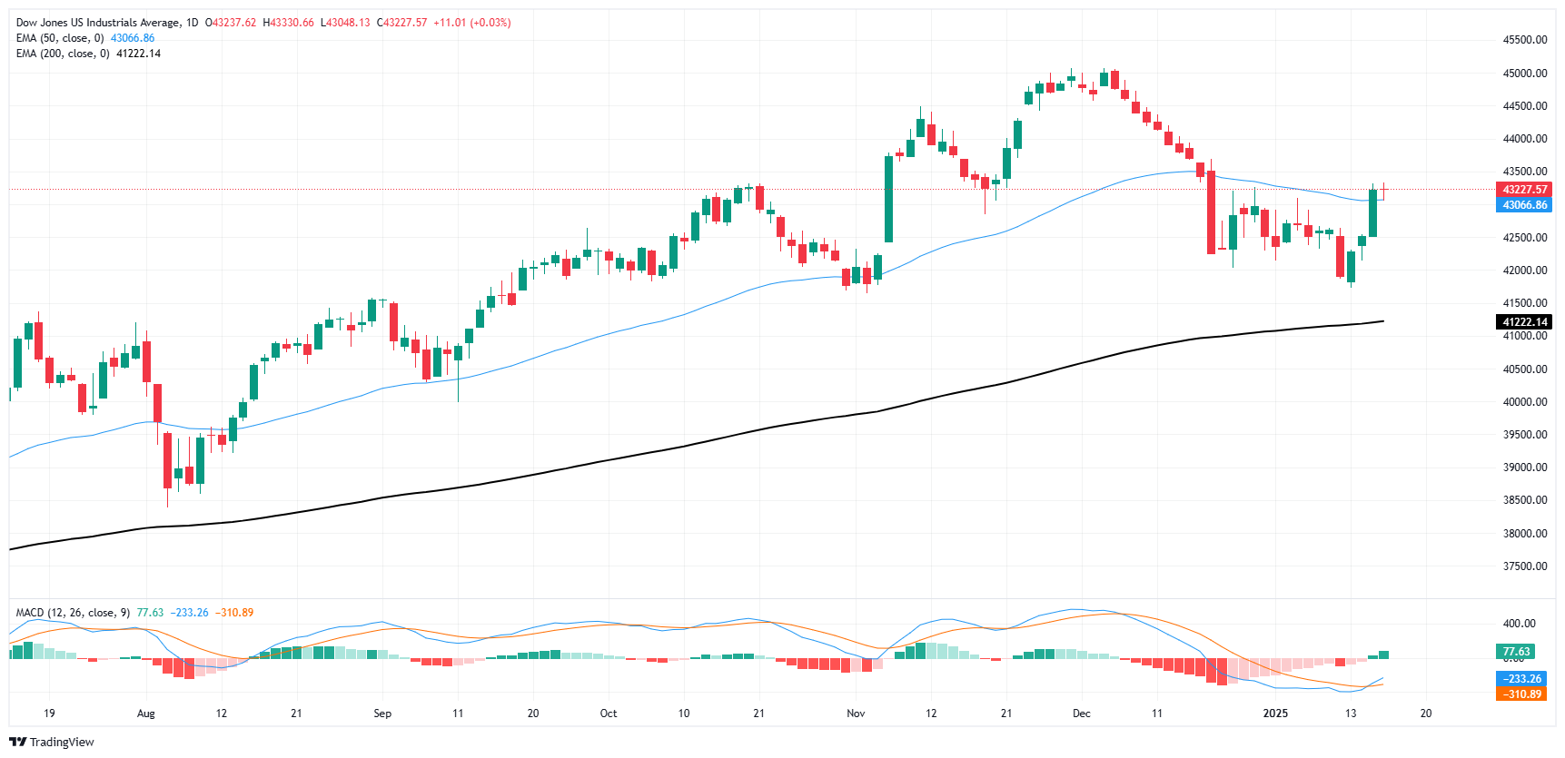 投资者继续将道琼斯指数推回高位,决心将价格走势维持在50日EMA北部的43,000附近。道指在43,200附近试探水域,主要价格水平通过日内图表行动提供技术支撑。