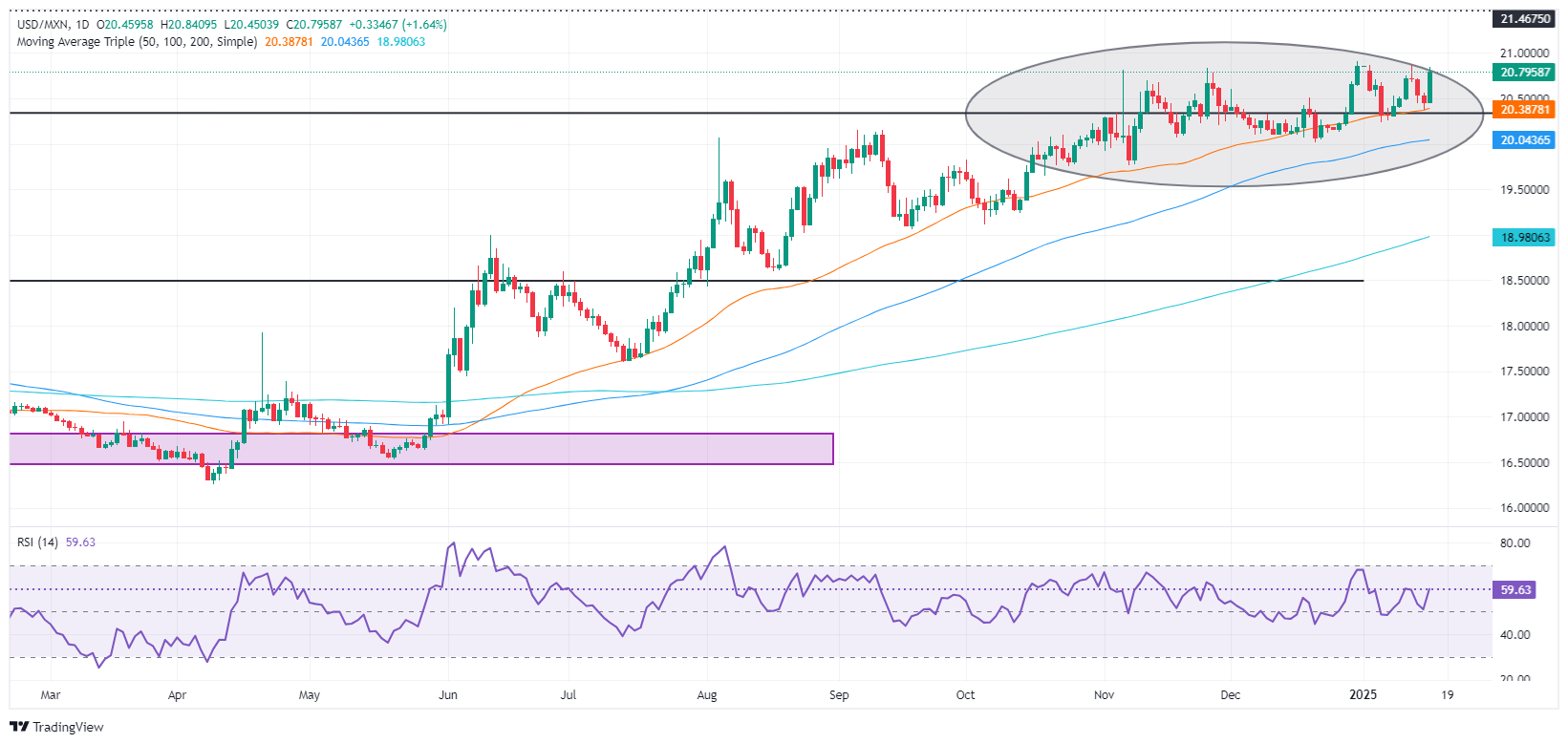 周四,这对外汇组合恢复了上升趋势,交易员关注年初至今(YTD)高点20.90。截至发稿时,美元/墨西哥比索在20.86面临强阻力,即1月13日高点。若突破这些水平,预计将进一步上涨,下个关键阻力位出现在21.46,即2022年3月8日高点,随后是21.50和22.00心理关口