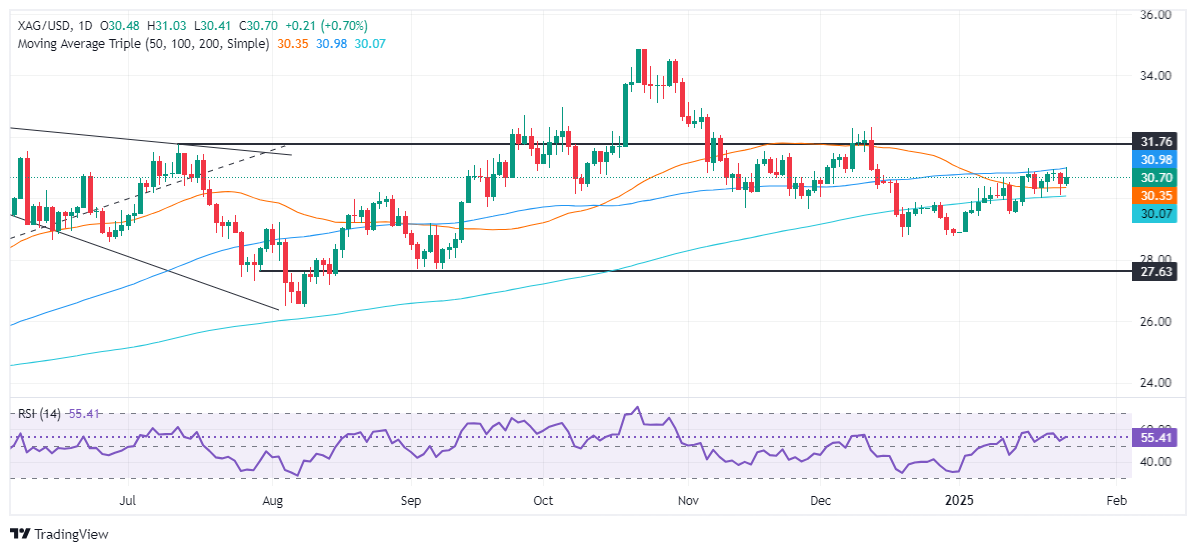 - 白银从30.36美元反弹,突破50日SMA,但在更高的阻力位上挣扎。