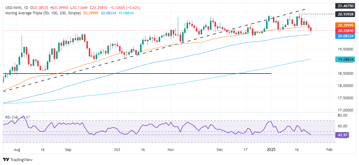 美元/墨西哥比索跌破50日简单移动平均缐(SMA)20.37,并延续跌势至100日SMA 20.22,但空头未能将价格推低至后者下方,目前在20.20-20.30区间中点附近盘整。
