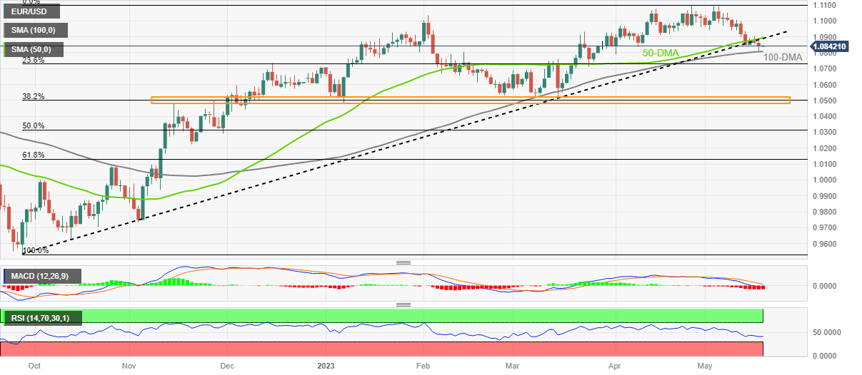 也就是说,相对强度指标(14)疲弱和100日均缐支撑引发欧元/美元自1.0800关口反弹。然而,欧央行行长拉加德发表讲话之前,MACD信号看跌和市场情绪谨慎,以及市场担忧美国债务违约,考验多头。