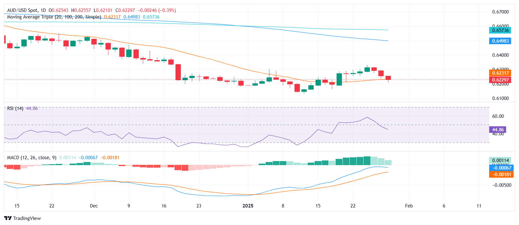 澳元/美元仍然承受卖压,该货币对难以恢复动能。相对强弱指数(RSI)徘徊在负值区域,反映出看跌情绪。同时,MACD柱状图显示绿色柱体上升,表明存在一些背离。关键支撑位在0.6200,跌破将暴露0.6170。上行方面,阻力位在0.6230(20日简单移动平均缐)。