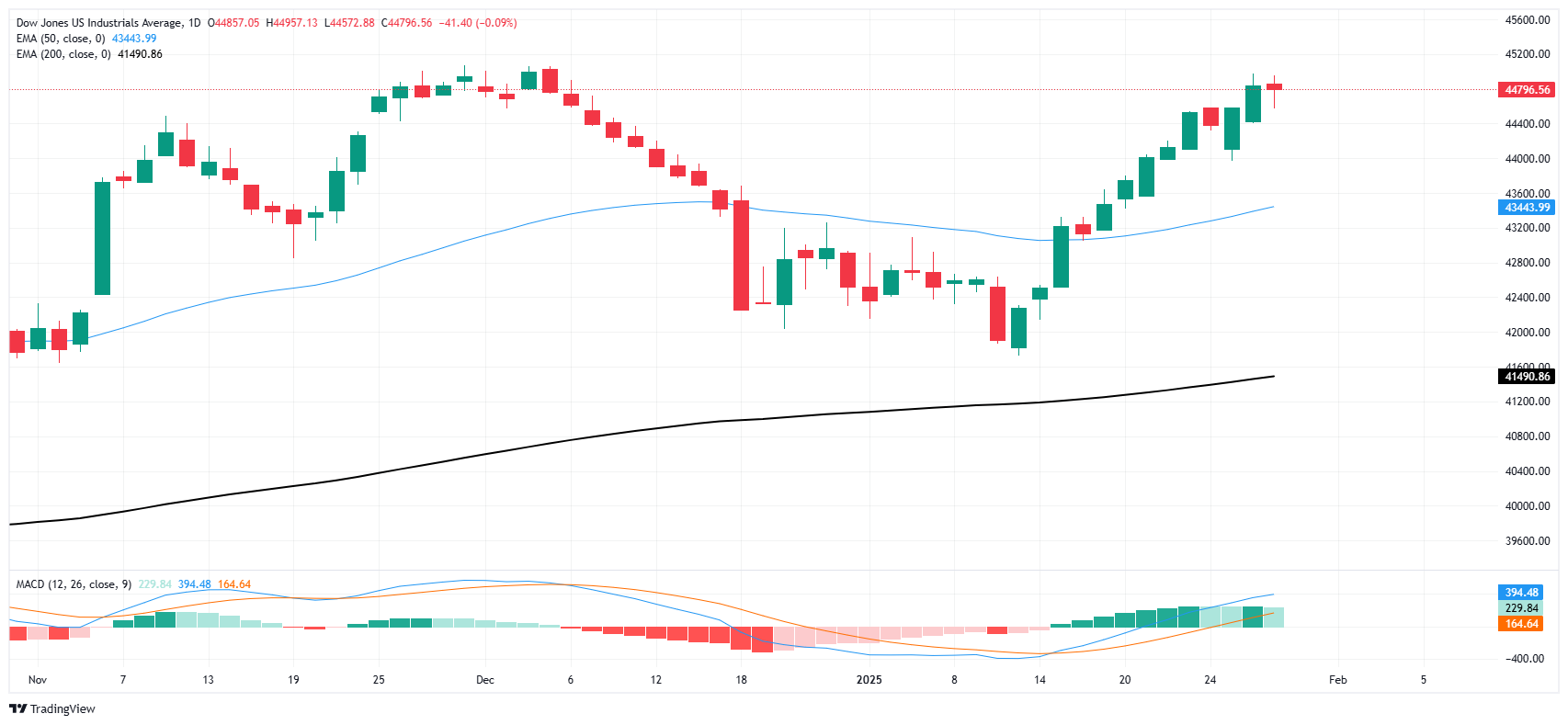 道琼斯工业平均指数在45,000点以上的纪录高位以南乾涸,盘中价格走势在44,800点附近试探。若突破上行,道琼斯将创下新的历史高点,而若出现看跌逆转,将标誌著这一主要股指自2024年中期以来的首次"低高点"模式。