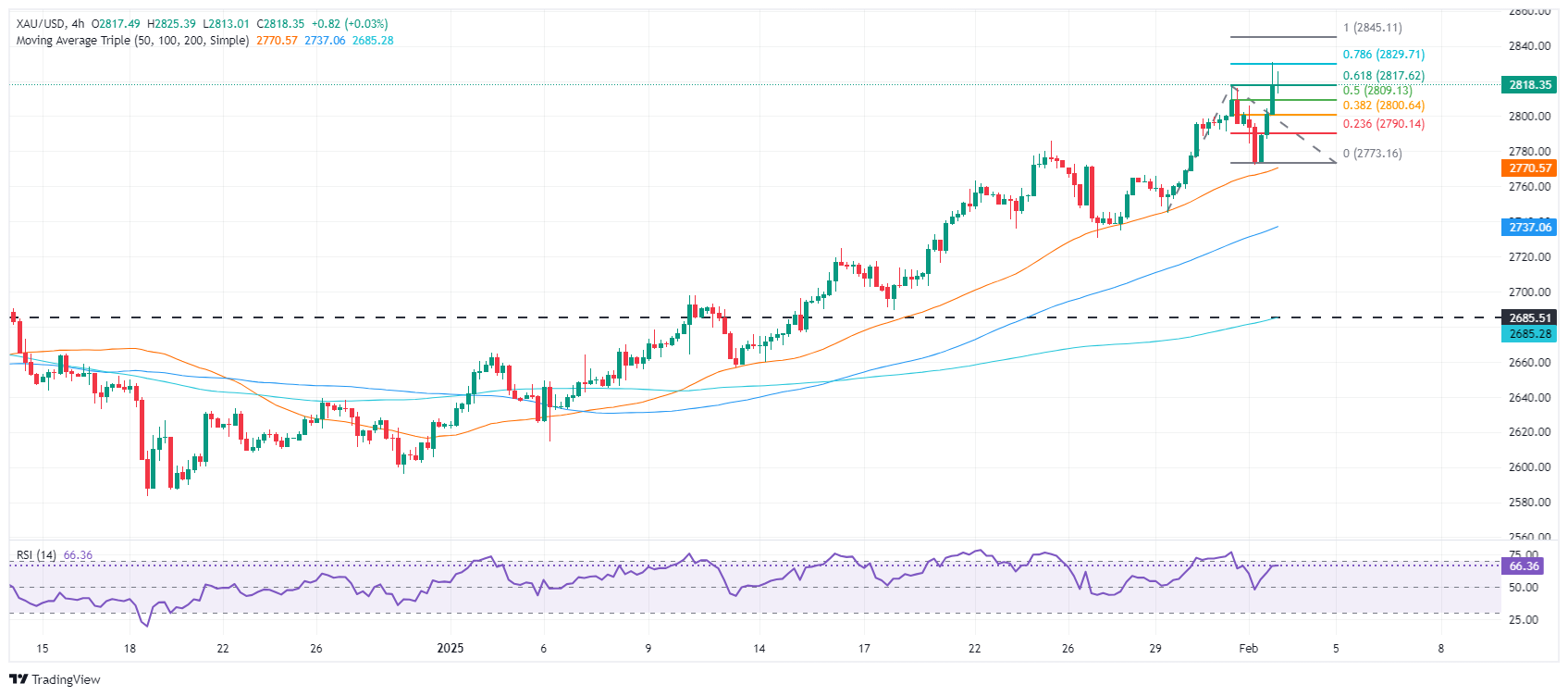 如果黄金/美元突破2830美元,下一个阻力位将是1月25日至1月31日上涨阶段的100%斐波那契水平附近的2844美元,如下图4小时图所示。如果突破,下一个阻力位将是161.8%斐波那契延展位2889美元,之后是2900美元。