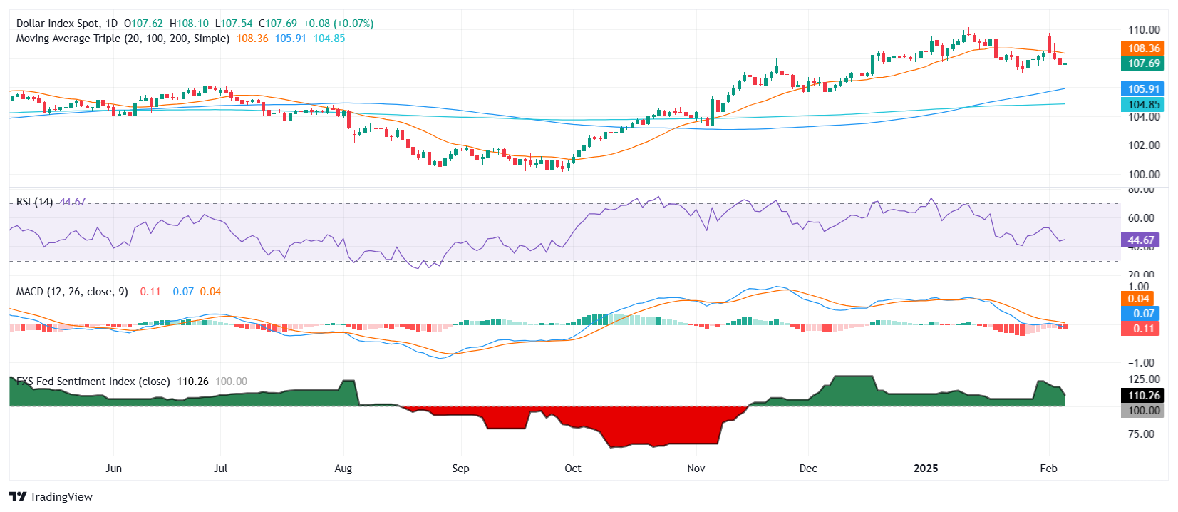 美元指数难以维持近期涨幅,跌破108.50的20日简单移动平均缐(SMA)。相对强弱指数(RSI)保持在50以下,表明看跌动能增加。由于经济数据喜忧参半,美元指数现在看似准备测试107.00的心理支撑位,下行风险增加,云雾笼罩美联储的鹰派政策前景。