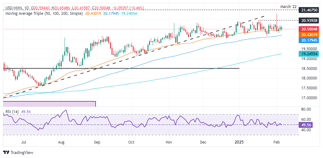 在决议前触及日低20.41后,USD/MXN货币对已收复部分失地,汇率在20.45 – 20.55区间内徘徊。交易者关注的第一个关键阻力位将是2月5日的高点20.71,一旦突破,可能会测试1月17日的高点20.90。下行方面,如果卖家将汇率推低至20.41的50日均缐以下,可能会将其推向20.22的100日均缐。