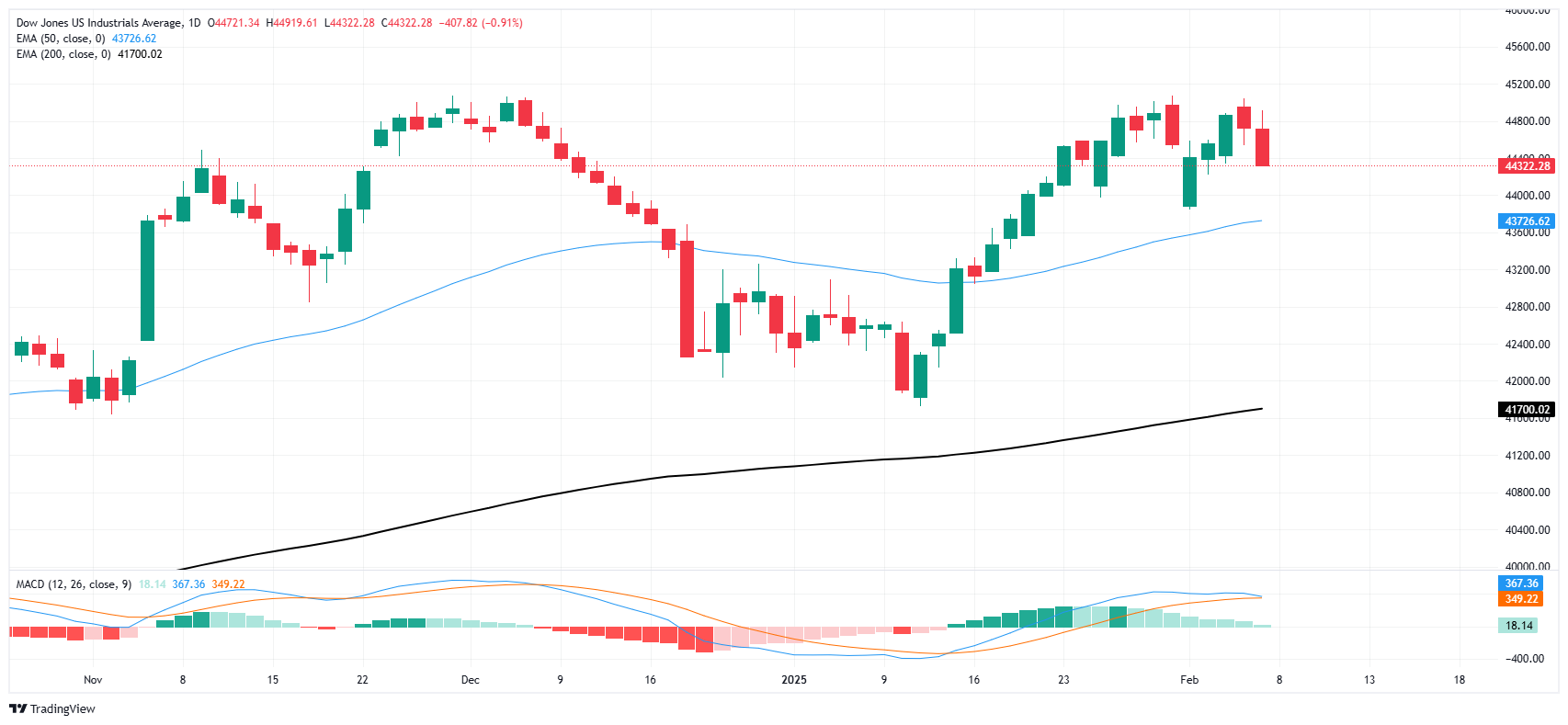 道琼斯指数连续第二天下跌,跌幅400点,回落至44,300区域。44,000关口重新进入视野,该指数从另一次未能将主要股指推升至45,000关键价格水平的尝试中下跌超过1.5%。看跌回调的直接目标停留在接近43,730的50日指数移动均缐(EMA)