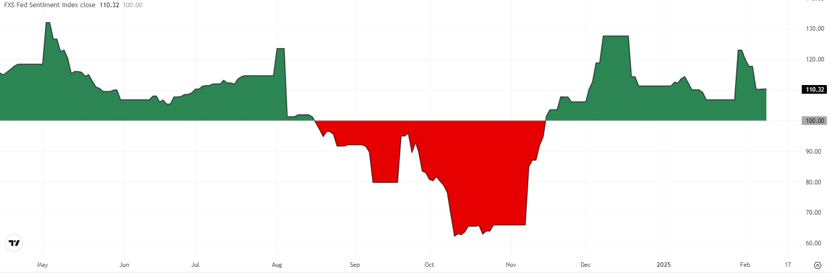 在1月份的政策决定之后,FXStreet(FXS)美联储情绪指数攀升至120以上,反映出鹰派情绪。然而,自那时以来,美联储情绪指数回落至110,因為一些政策制定者采用了相对不那麽鹰派的语言。侭管这一下降表明美联储正在软化其语气,但尚未发出鸽派转变的信号