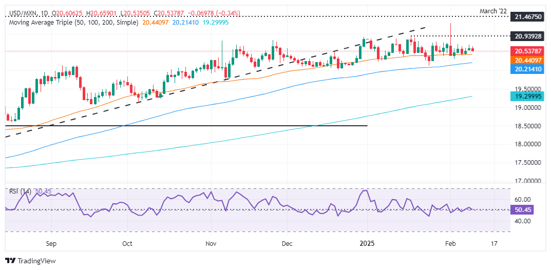 周二,墨西哥比索(MXN)在周一收盘下跌0.35%后,兑美元(Greenback)保持稳定。然而,随著美国总统唐纳德·特朗普对墨西哥钢铁和铝征收25%关税(预计于3月12日生效),比索出现反弹。与贬值相反,墨西哥货币略有走强,美元/墨西哥比索(USD/MXN)汇率為20.59,下跌0.23%,此前曾触及日高20.65。