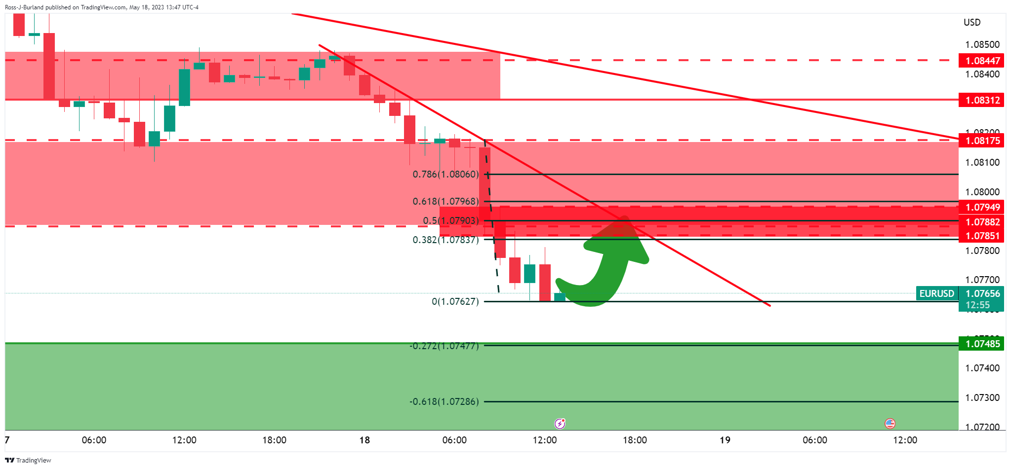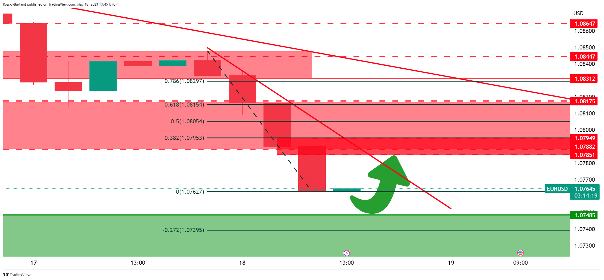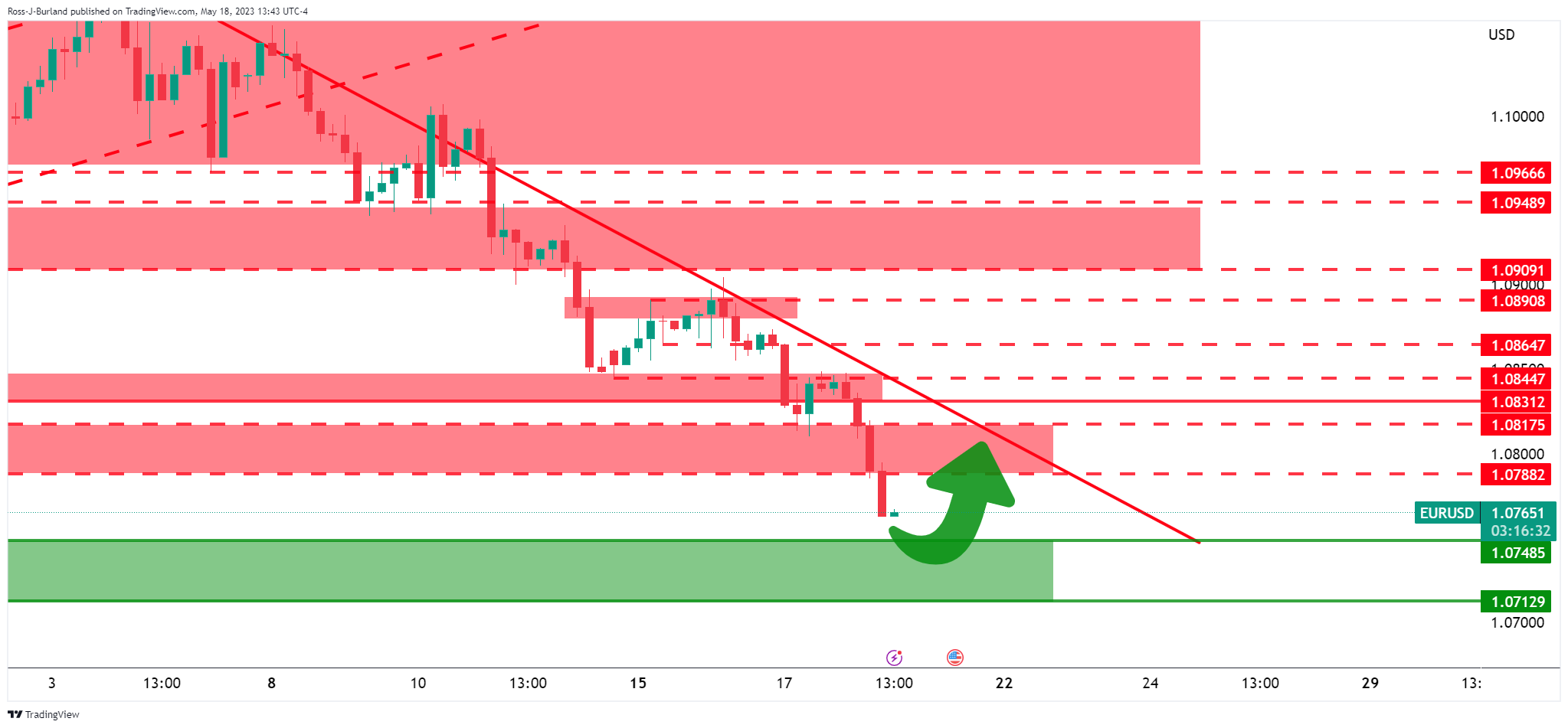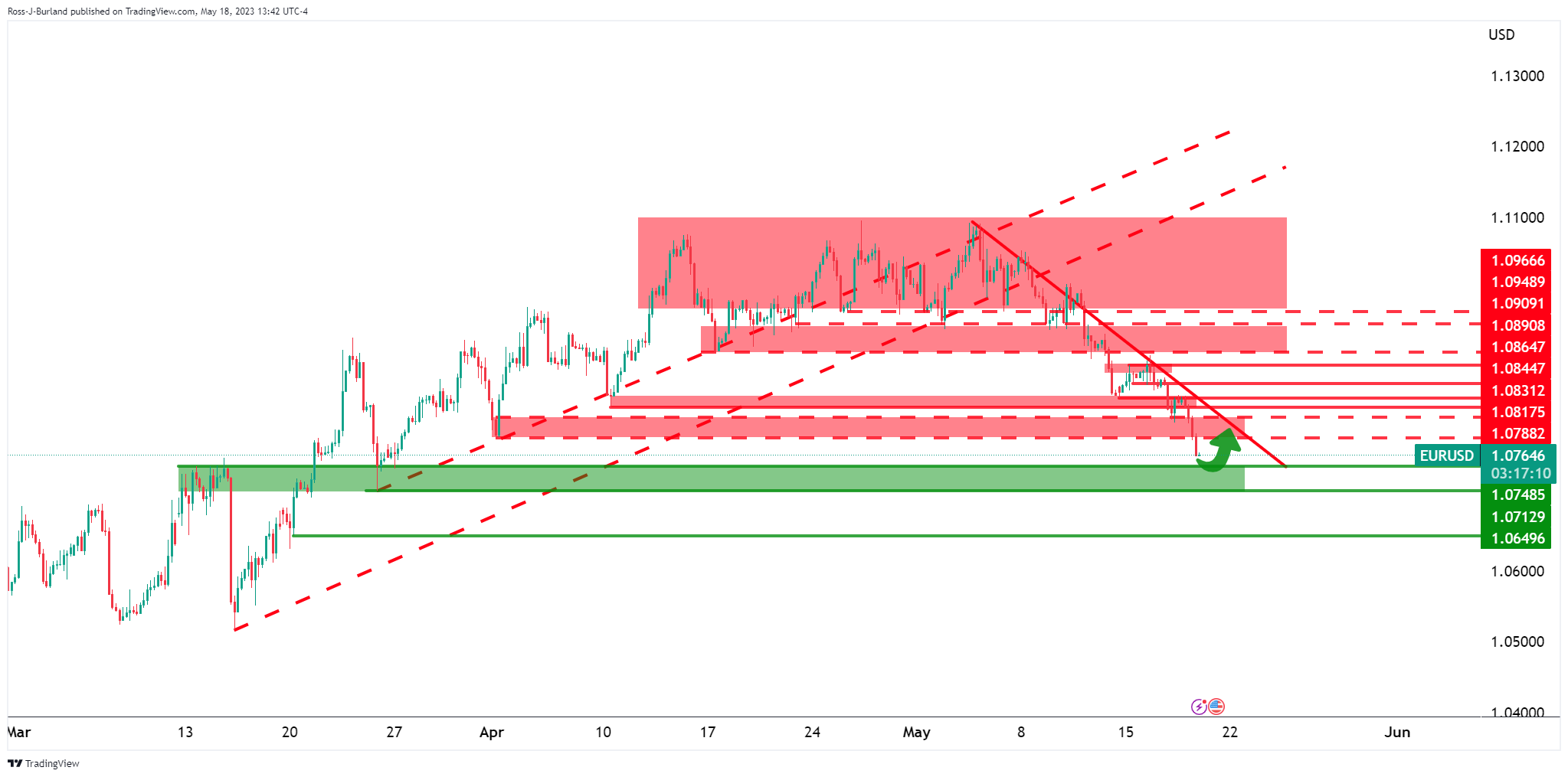 市场对美国达成上调债务上限协议以避免可能违约维持乐观情绪的环境下,美元再次因新一轮稳健的经济数据上涨,美元走强,欧元承压。然而,从技术面来看,欧元/美元下跌正放缓,正如以下形态将说明的那样,欧元/美元整理前景加大。既然如此,适合多头的任务出现:
