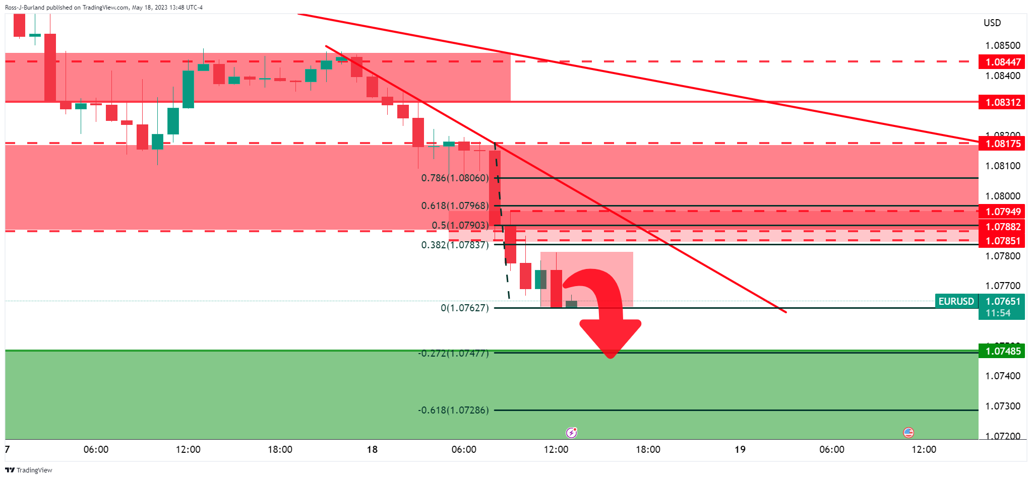 欧元/美元仍大幅下跌,并已遇阻1.0780前期支撑。出现了欧元/美元将延续整理于1.0750s和1.0700潜在支撑区域的前景。