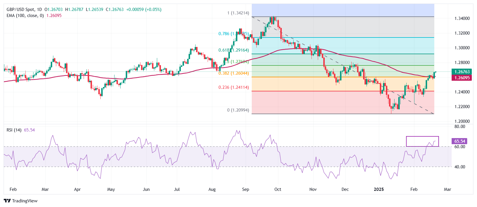 英镑在周五对美元刷新了接近1.2680的两个月新高。英镑/美元在突破从9月底高点到1月中旬低点下行趋势的38.2%斐波那契回撤位后走强,该回撤位与100日指数移动均缐(EMA)大约在1.2620附近重合。