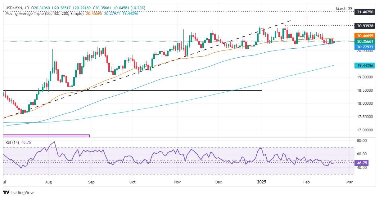 由于墨西哥经济在 2024 年最后一个季度放缓,墨西哥比索(MXN)在周五对美元(USD)失去了一些地面。这表明,在与美国总统唐纳德·特朗普的贸易政策相关的不确定环境中,前景并不像预期的那样乐观。USD/MXN 交易于 20.33,涨幅為 0.14%。